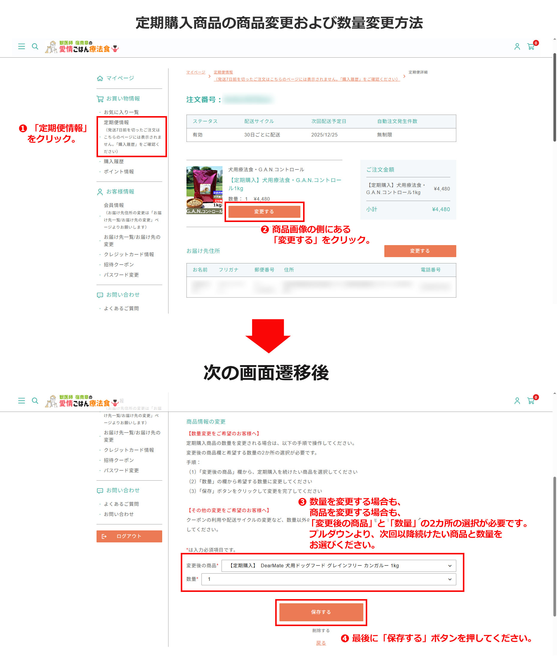 ④次のページの「商品情報変更」の欄にあるプルダウンより、次回以降続けたい商品と数量をお選びください。
